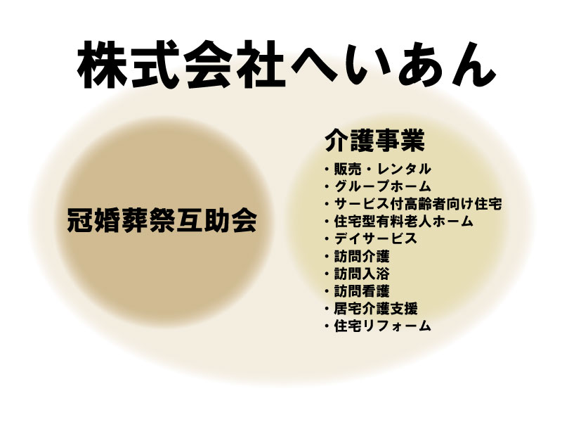 会社概要 company会社概要 商号 株式会社へいあん 所在地 〒254-0053神奈川県平塚市桜ヶ丘1-35 設立年月日 昭和49年2月 代表取締役社長 相馬 秀行 社員数 54名 資本金 80百万円 関連会社 平安レイサービス株式会社山大商事株式会社 事業内容 冠婚葬祭互助会、介護事業 IR情報 決算公告 SONY DSC